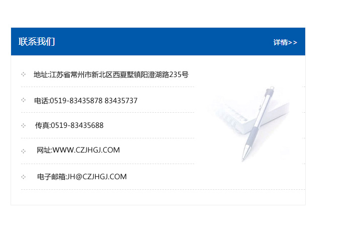 地址:常州市新北區友邦商務大廈1幢16、17層  電話:0519-85101652  傳真:0519-85112595  郵編:213022  網址:www.cz-jiayue_cn.qsjwny.com  郵箱:xiajifengaa@163.com